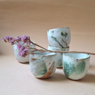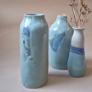 Je vous propose des petites séries (tasses, bols, saladiers, mugs, soliflores….) et des pièces uniques, réalisées en grès et en raku. Le grès cuit à haute température (1280°C) permet une résistance et une facilité d’utilisation pour les objets du quotidien.